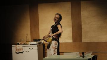 Ambra Senatore a toujours aimé explorer le geste quotidien , depuis son premier solo Eda-solo, variation décalée entre une femme et son balai, inspiré par le tailleur vert de sa grand-mère. Autre petit projet domestique, qu’elle monte en une semaine, complète ce diptyque domestique. Une femme bien apprêtée, prépare une omelette dans sa cuisine. Sourire éclatant, pauses tout en féminité stéréotypée, elle se plie à ce qu’on attend d’elle.